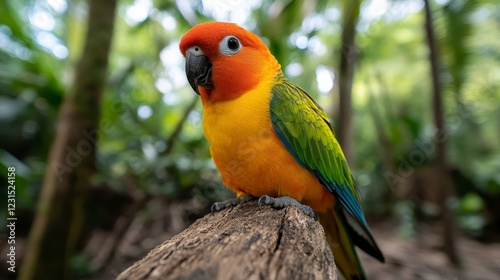 © aun, Fototapeta premium Vibrant Sun Conure Perched on Branch in Lush Green Jungle Setting