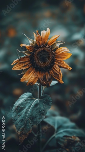 Naklejka premium Vibrant sunflower among dark foliage.