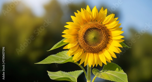 © ProArt Studios, Fototapeta premium Vibrant Sunflower Close-Up Golden Petals and Spiraling Seed Head Illuminated by Gentle Sunlight.