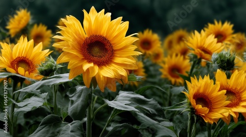 Fototapeta premium Vibrant Sunflower Field in Natural Growth with Dew on Blooms Under Soft...