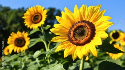 Fototapeta premium Vibrant sunflower field under a clear blue sky on a sunny day scenery