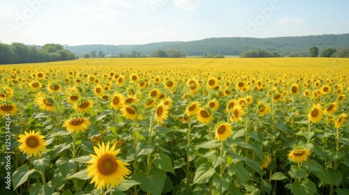 © Kitta Studio, Obraz premium Vibrant Sunflower Field Under Blue Sky in Rural Landscape