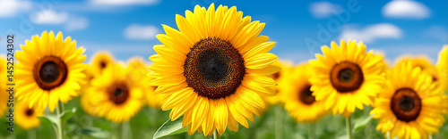 Obraz premium Vibrant sunflower field under bright blue sky with fluffy clouds on a sunny summer day, banner, header