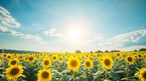 Fototapeta premium Vibrant Sunflower Field Under Bright Summer Sky with Distant Farmhouse