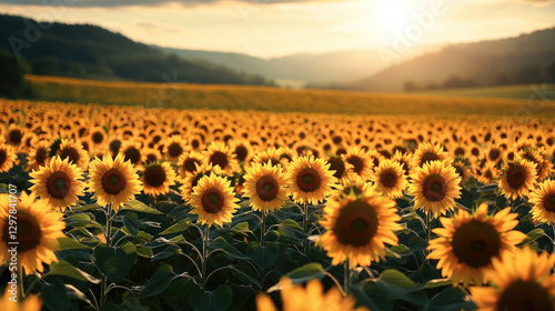Fototapeta premium vibrant sunflower field under golden sunset, showcasing nature beauty and...
