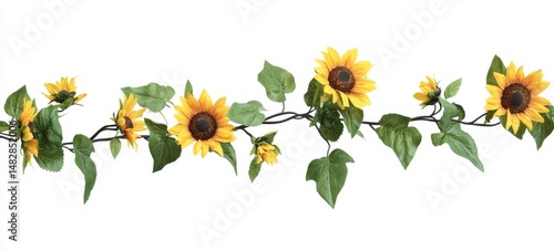 © Jumroon, Obraz premium Vibrant Sunflower Garland with Green Leaves on White Background