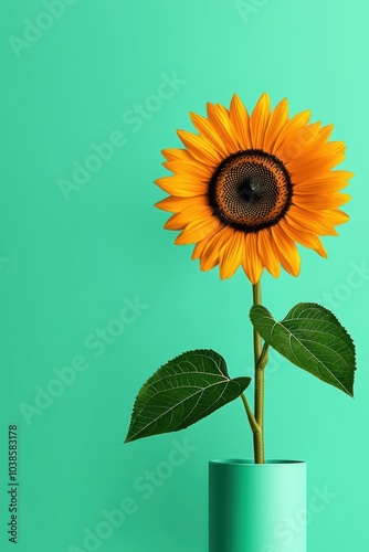 © Arnon Parnnao, Obraz premium Vibrant sunflower in a modern vase against a turquoise background.