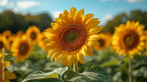 Fototapeta premium Vibrant sunflower in bloom under a clear blue sky in a lush field