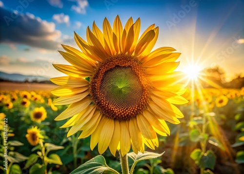 © Sirinporn, Obraz premium Vibrant Sunflower in Golden Sunlight - Summer Field Bloom