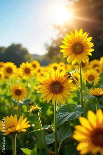 Fototapeta premium Vibrant sunflowers and wildflowers basking in the golden sunlight of a summer meadow A breathtaking display of nature's beauty, perfect for nature, summer, and floral themes , peaceful, leaf