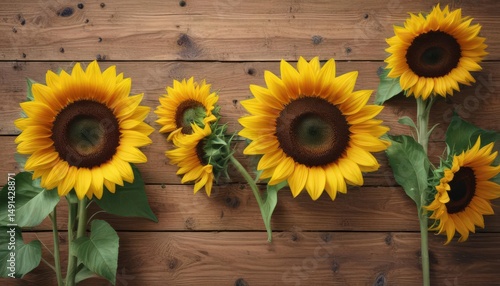 Obraz premium Vibrant sunflowers arranged on rustic wooden board, decoration, sunny