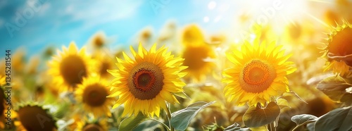 © VibrantLens, Fototapeta premium Vibrant sunflowers basking in golden sunlight.