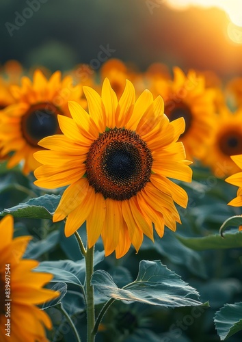 Naklejka premium Vibrant sunflowers in a field, representing summer and happiness.