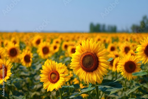 Fototapeta premium Vibrant Sunflowers in a Sunny Field Under Clear Blue Sky