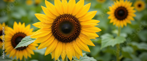 © Yury, Obraz premium Vibrant sunflowers in full bloom with striking yellow petals and deep brown centers conveying a cheerful and uplifting atmosphere in a lush green field
