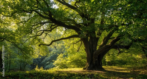 © NeuralNiche, Fototapeta premium Vibrant sunlit forest backdrop with lush greenery and copy space