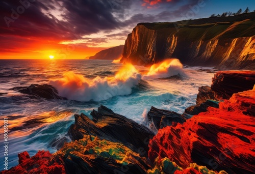 Fototapeta premium vibrant sunrise illuminating majestic cliffs sea, sunlight, light, rocky,...