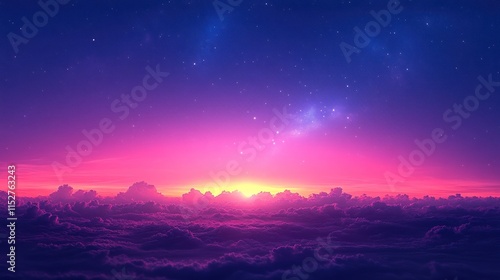 Fototapeta premium Vibrant sunrise over a sea of purple clouds, with a starlit sky.