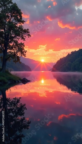 Obraz premium Vibrant sunrise over a tranquil lake, reflecting serenity and peaceful...