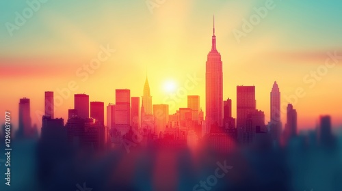 © Satisgitfied, Fototapeta premium Vibrant Sunrise Over City Skyline with Iconic Skyscrapers