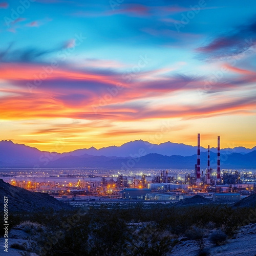 Fototapeta premium Vibrant sunrise over industrial landscape near mountains Generative AI