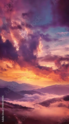© AbirHasanSelim, Fototapeta premium Vibrant sunrise over misty mountain peaks and dramatic clouds