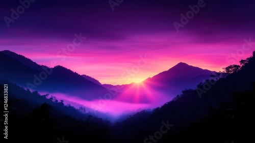 Fototapeta premium Vibrant sunrise over misty mountain valley with colorful sky and silhouetted...