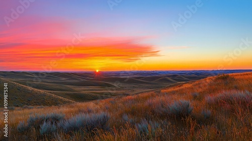 Fototapeta premium Vibrant sunrise over rolling hills and grasslands.