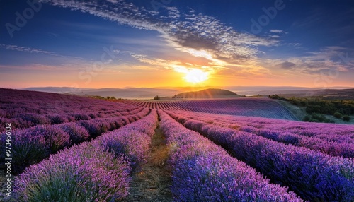 Obraz premium Vibrant Sunrise Over Rolling Lavender Fields, Creating a Breathtaking Color...