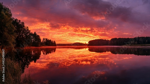 © Armando, Fototapeta premium Vibrant sunrise reflecting on a tranquil lake's surface.