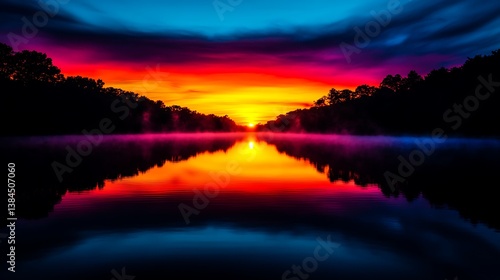 © bagus_, Obraz premium Vibrant Sunrise Reflecting on Serene Lake.