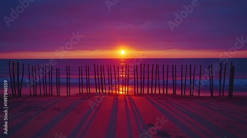 © Jamal, Obraz premium Vibrant Sunset Beachscape with Wooden Fence Silhouettes