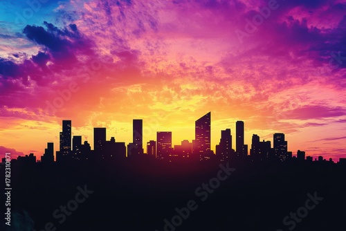 Fototapeta premium Vibrant sunset casting colorful hues over a city skyline filled with silhouettes