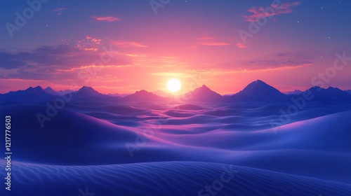 Fototapeta premium Vibrant Sunset Casting Colorful Hues Over Tranquil Desert Dunes and Distant Mountains at Twilight