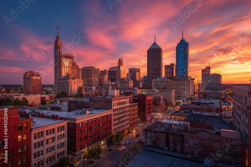 © Photo Hub, Obraz premium Vibrant sunset casts a warm glow on the eclectic mix of ancient and modern buildings that shape the iconic Indianapolis cityscape skyline.