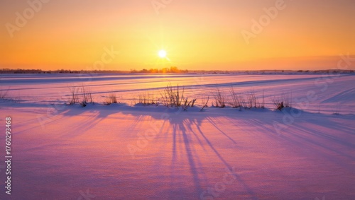 Naklejka premium Vibrant sunset casts long shadows across a snow covered field with bare branches