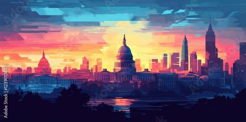 © NpicArt, Fototapeta premium Vibrant Sunset Cityscape Featuring Iconic Capitol Dome
