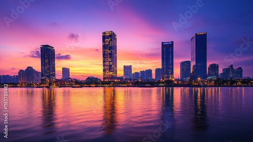 © huhu, Fototapeta premium Vibrant sunset cityscape reflected in calm water.