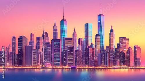© Abdul, Fototapeta premium Vibrant Sunset Cityscape Skyline, Modern Metropolis at Dusk