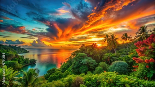 Obraz premium Vibrant sunset hues of orange, coral, and turquoise blend with lush green...