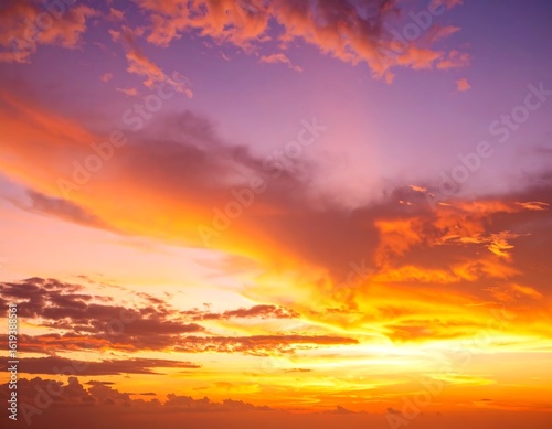 Fototapeta premium Vibrant sunset hues paint the sky with fiery oranges and purples, clouds...