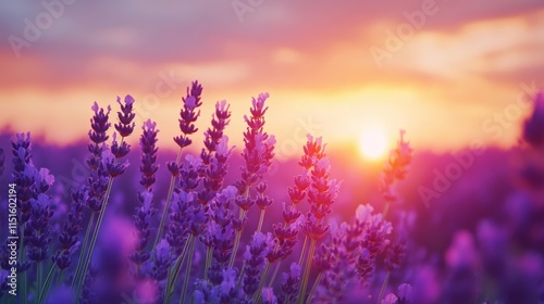 Naklejka premium Vibrant sunset illuminating a violet lavender field, showcasing the stunning...