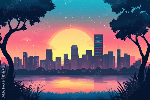 © Ivan, Fototapeta premium Vibrant sunset illuminating city skyline across serene lake with lush greenery