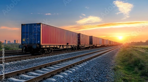 Fototapeta premium Vibrant sunset illuminating freight train containers along the railway tracks...