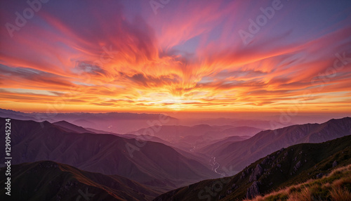 © Dmitrii Suslov, Naklejka premium Vibrant sunset illuminating mountain valley panorama, natural beauty