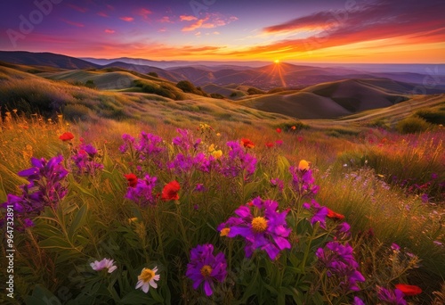 Fototapeta premium vibrant sunset illuminating rolling hills covered colorful wildflowers under...