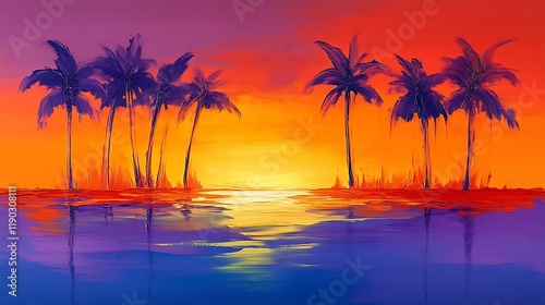 Obraz premium Vibrant Sunset Landscape With Palm Trees Silhouetted