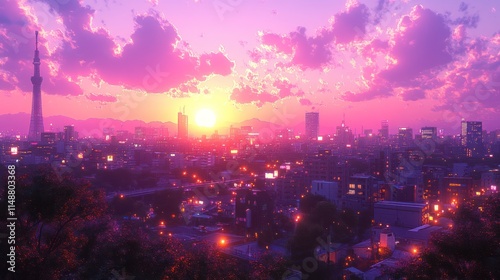 Fototapeta premium Vibrant sunset over a city skyline.
