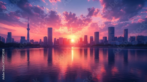 Naklejka premium Vibrant sunset over a city skyline reflected in calm water.