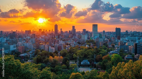 Obraz premium Vibrant sunset over a city skyline, trees and buildings bathed in warm light